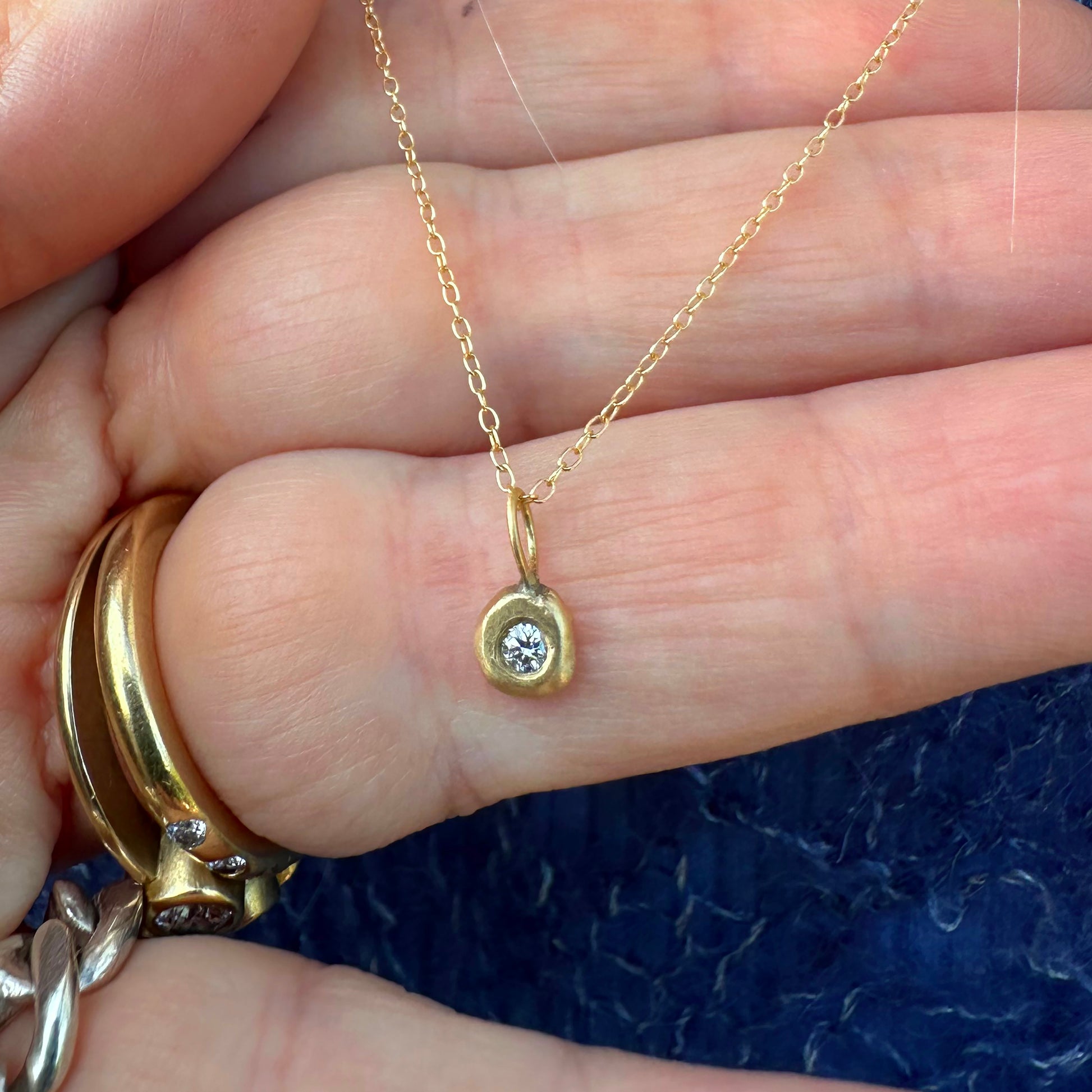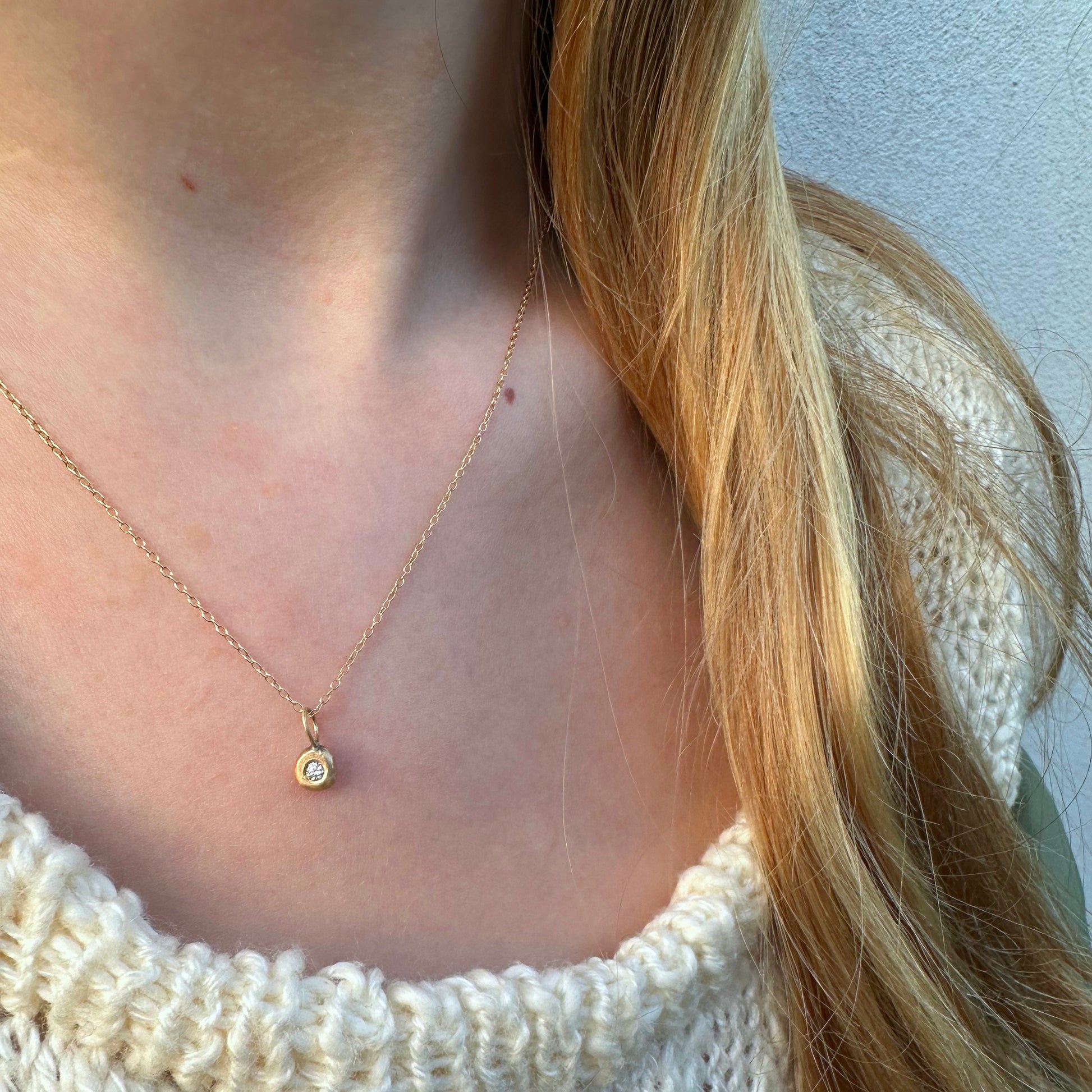 Halskæde med lille flad guldklump med diamant.