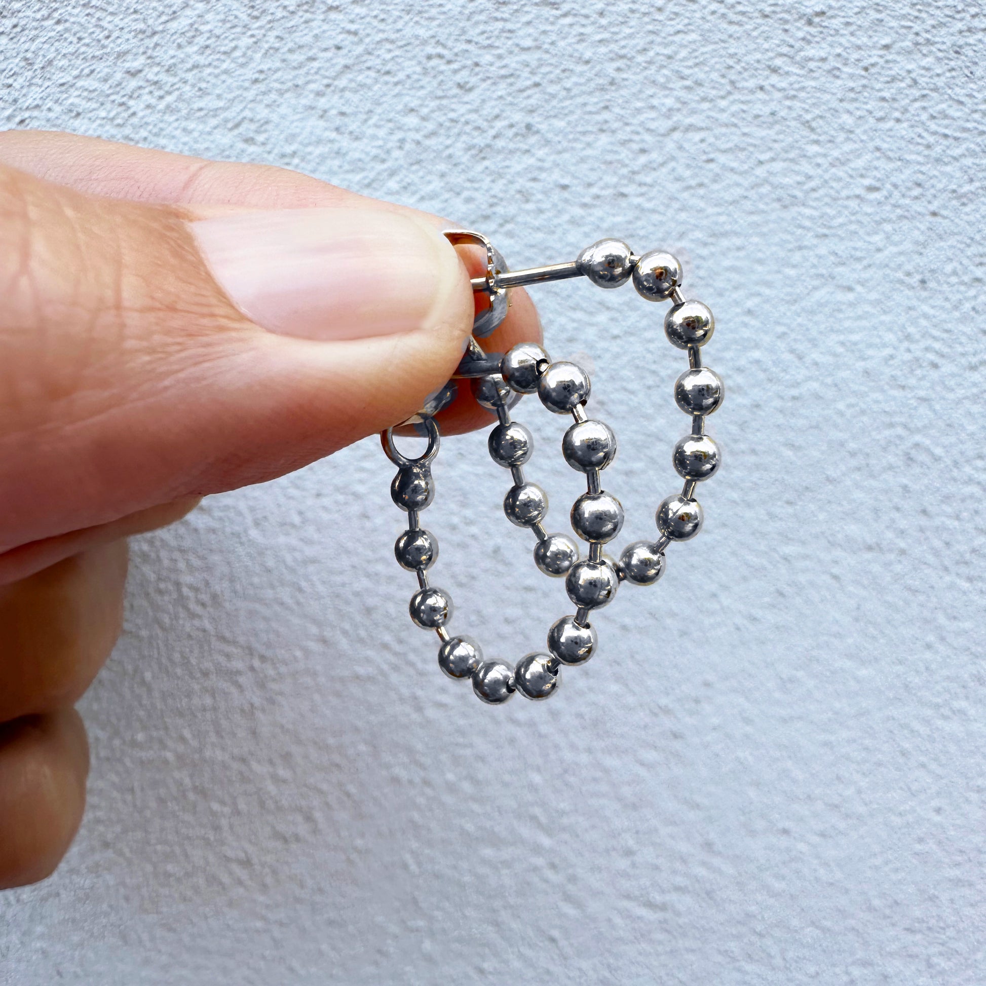 Made of loose ball chain, so the earring can move in all joints. The earring is put on by taking the last joint where the lock is mounted and placing it on the back of the ear on the ear stud.